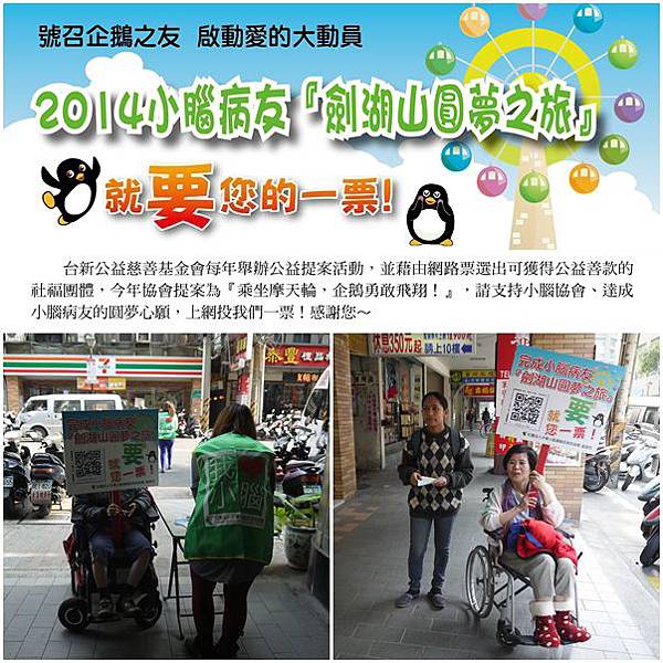 昨天是北區週三固定聚會,企鵝們決定要為「您的一票,決定愛的力量」拉票,希望可以衝票數,擠入前十名,於是大家下午一起到協會附近的街上、商店門口前拉票。期盼企鵝們的熱情,引領我們更上一層樓。